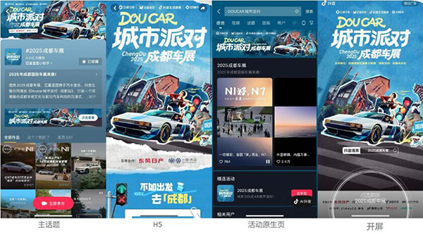 在抖音站内,平台围绕主话题#2025成都车展 和IP构建起多触点强曝光矩阵,上线主话题页、活动H5、活动原生页并投放抖音开屏等广告资源位,高效引流激发创作者投稿热情,也为合作品牌打造线上种草核心阵地。活动期间,整体曝光量超10亿,话题播放量超过5亿,互动量超400万。