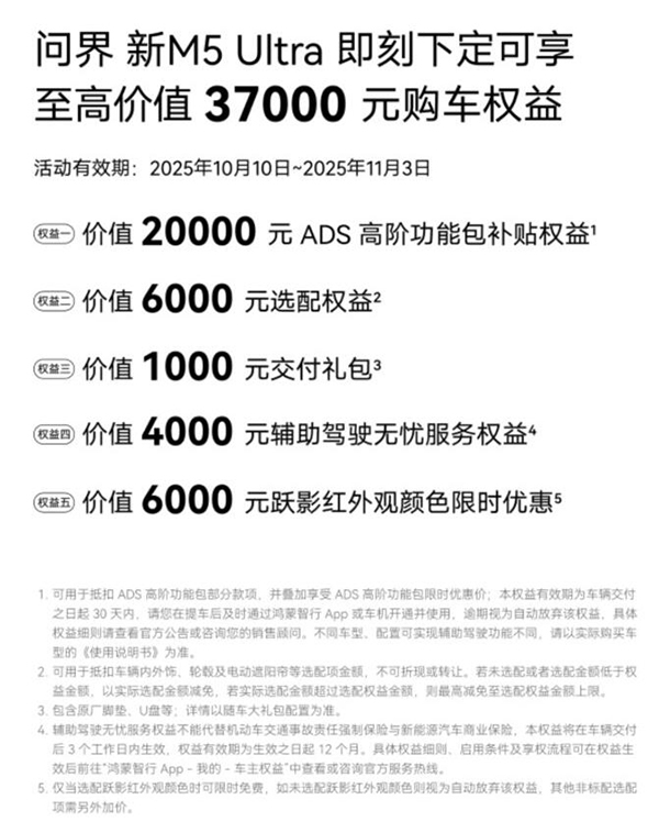 除了出色的产品力之外,问界新M5 Ultra还提供至高价值37000元的购车礼遇,涵盖20000元ADS高阶功能包补贴、6000元选配权益、1000元交付礼包、4000元辅助驾驶无忧服务权益。跃影红新车色还推出6000元限时优惠。丰富的购车权益直击辅助驾驶与个性化选配两大核心需求,叠加多项优惠,使当下成为入手问界新M5 Ultra的最佳时机。